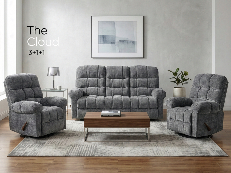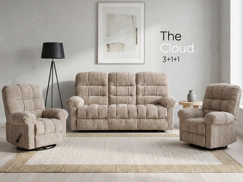 Imagine a suite that not only cradles you in cosy comfort but also moves with the flow of your life. Meet The Cloud, our new manual swivel recliner upholstery suite designed to be your ultimate retreat. Available as 3 seater, 2 seater and armchair. Sink into the blissful, cosy comfort of the new Cloud Armchair. With a smooth 360-degree swivel and an easy-to-use manual recliner, finding your perfect spot for relaxation has never been simpler. Just pull the handle, lean back, and float away. Available in sophisticated Graphite and warm Beige Fabric to perfectly complement your home.