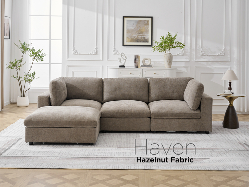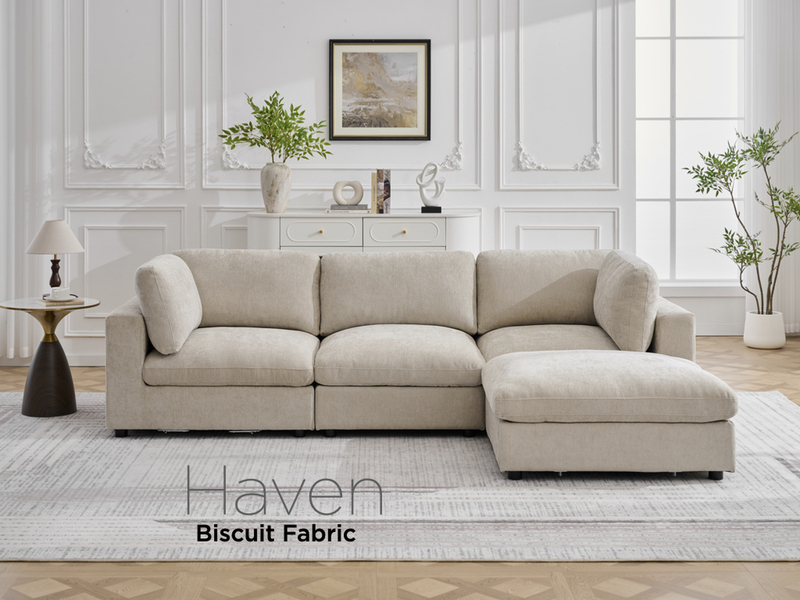 Most furniture asks you to plan your life around it. We designed a sofa that plans its life around you. Whether you’re moving into a cosy studio, hosting a crowded game night, or just need a deep-seated sanctuary for a Sunday nap, the Haven modular system adapts in a snap.The secret is in the pieces. With our intuitive interlocking design and multi-purpose footstool, you can transition from a classic three-seater to a spacious L-shape lounger or even a pair of intimate chaises in minutes. It’s not just furniture; it’s a living system designed to grow, shift, and evolve alongside your home.Our modular collection in plush fabric now comes in two signature, nature-inspired tones: Biscuit and Hazelnut.