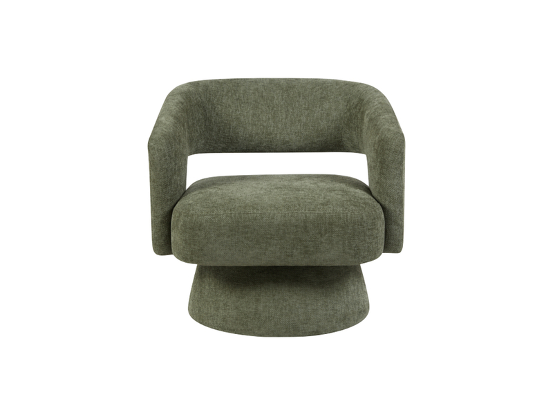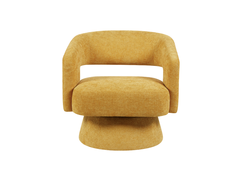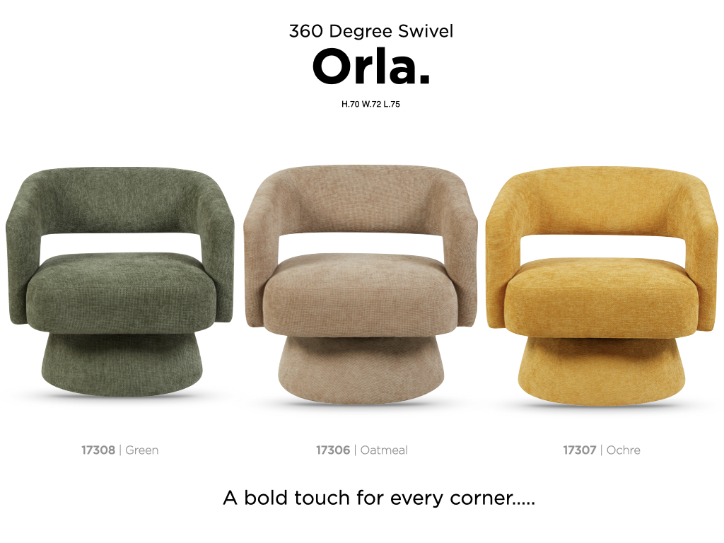 Make a statement from every angle. The Orla Accent chair features a unique, architectural "cut-out" backrest that creates a sense of lightness while providing a supportive, wraparound feel. Whether you choose the earthy Green, neutral Oatmeal, or vibrant Ochre, its plush upholstery and distinctive tapered pedestal base bring a high-end designer vibe to any modern living room or creative home office. Orla features a full swivel base, allowing you to stay in the center of the action or turn toward the view with ease.