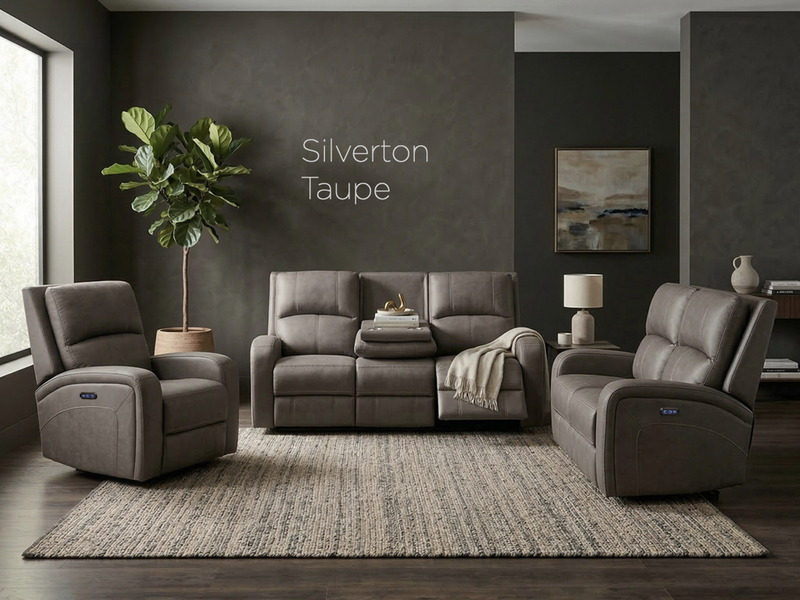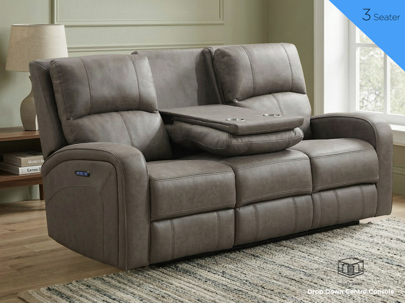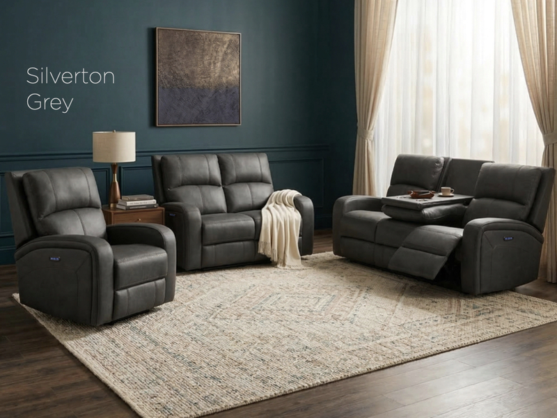 Unwind, recline, and relax in the lap of luxurious comfort. Our new Silverton electric recliner suite with a 3-seater featuring a drop-down console and cup holders is your ticket to a more relaxed and stylish lifestyle. Elevate your home with the perfect blend of comfort and elegance today. Crafted with premium fabric that is both soft to the touch and durable, this suite brings together a luxurious feel and lasting quality. Available in dark grey and taupe colours with pocket sprung seats and electric push button recline mechanism. The integrated USB ensures your devices stay charged while you unwind. With its traditional design and a stylish modern twist, the Silverton is available in a 3-seater, 2-seater, and armchair – the perfect fit for any home.