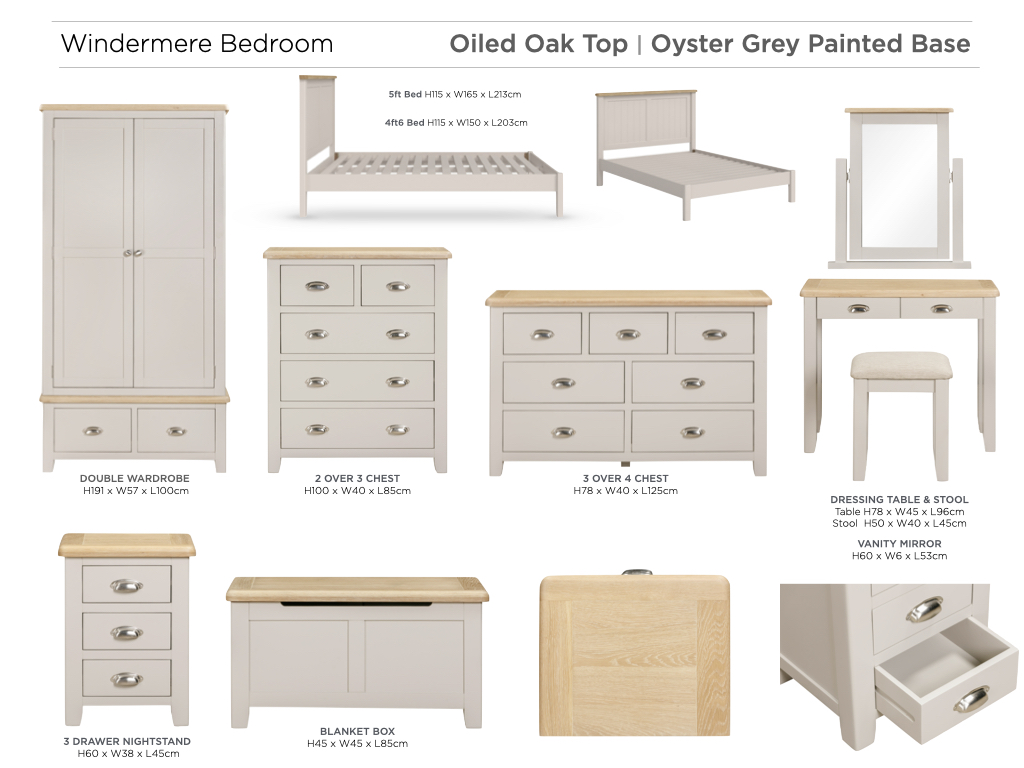 Introducing the Windermere Bedroom Collection, a perfect fusion of traditional charm and modern sophistication. Featuring elegantly oiled oak tops and a sleek Oyster Grey painted finish, this collection brings a refreshing twist to classic bedroom design. With a range of bedroom cabinets crafted for both style and practicality, it offers a chic storage solution for any bedroom.Complete the look by pairing it with our luxurious Jessica or Clara Gas Lift Storage Beds, available in stylish Grey or Beige upholstery. Together, they create a harmonious and modern bedroom haven, combining timeless elegance with contemporary comfort.